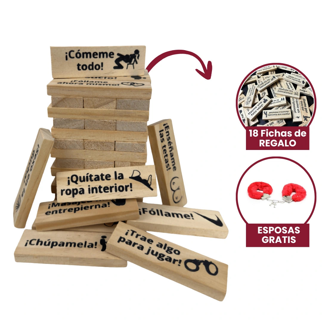 El juego incluye 20 o 48 fichas de madera (según la variante que elijas), cada una con un reto sexual distinto.